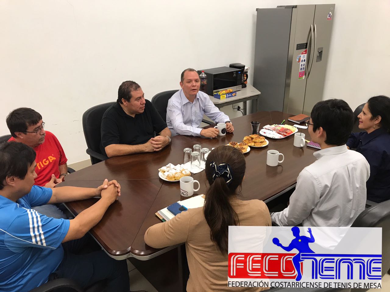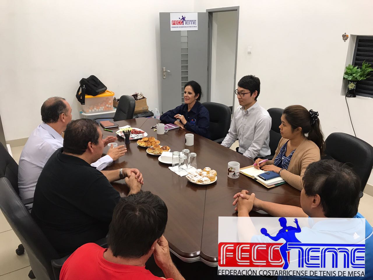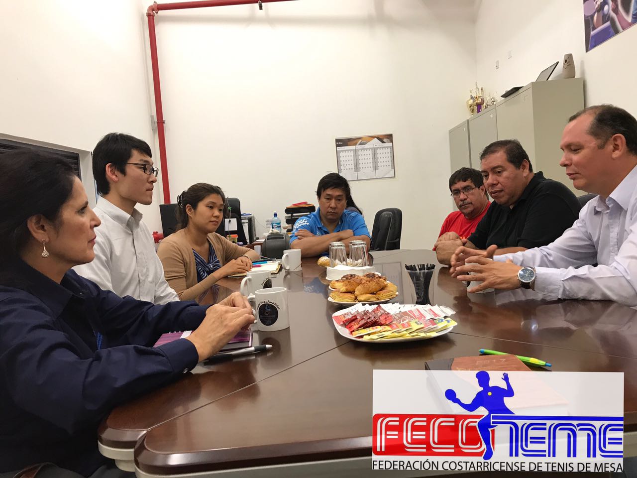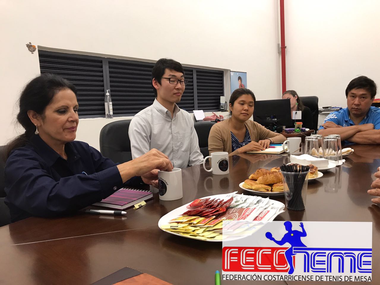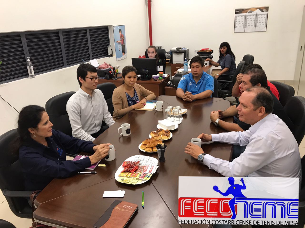 En el breve encuentro estuvo presente la Asistente Administrativa de la Junta Directiva de la FECOTEME la Srta., Ariana Castro Montero, el Gestor Sr. Arturo Silesky en compañía de la Sra. Rosario Hernández Rivas, el vocal Sr. Rafael Sánchez Lee, Sr. Ricardo Castro Tesorero y el Presidente de la Federación Costarricense de Tenis de Mesa Sr. Alexander Zamora Gómez.